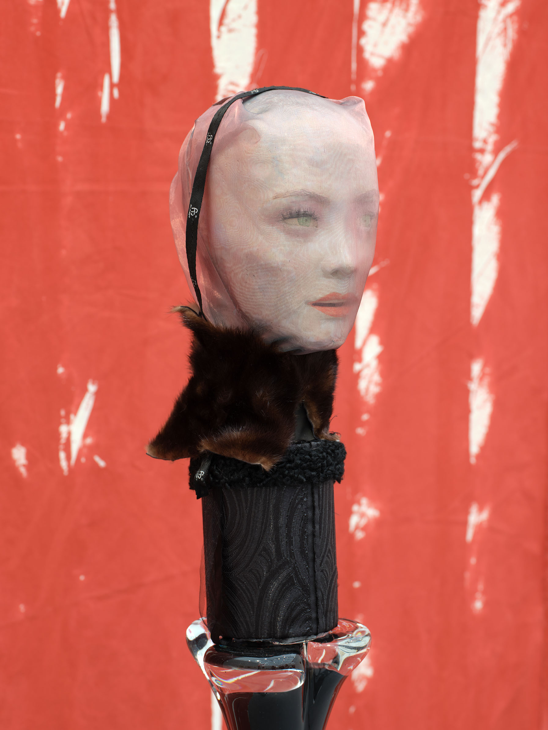Detail of Soshiro Matsubara, Confession IV, 2026, glazed ceramics, oil, wood, fur, false eyelashes, glass vase, 68 7/8 x 9 x 9 in (175 x 23 x 23 cm)