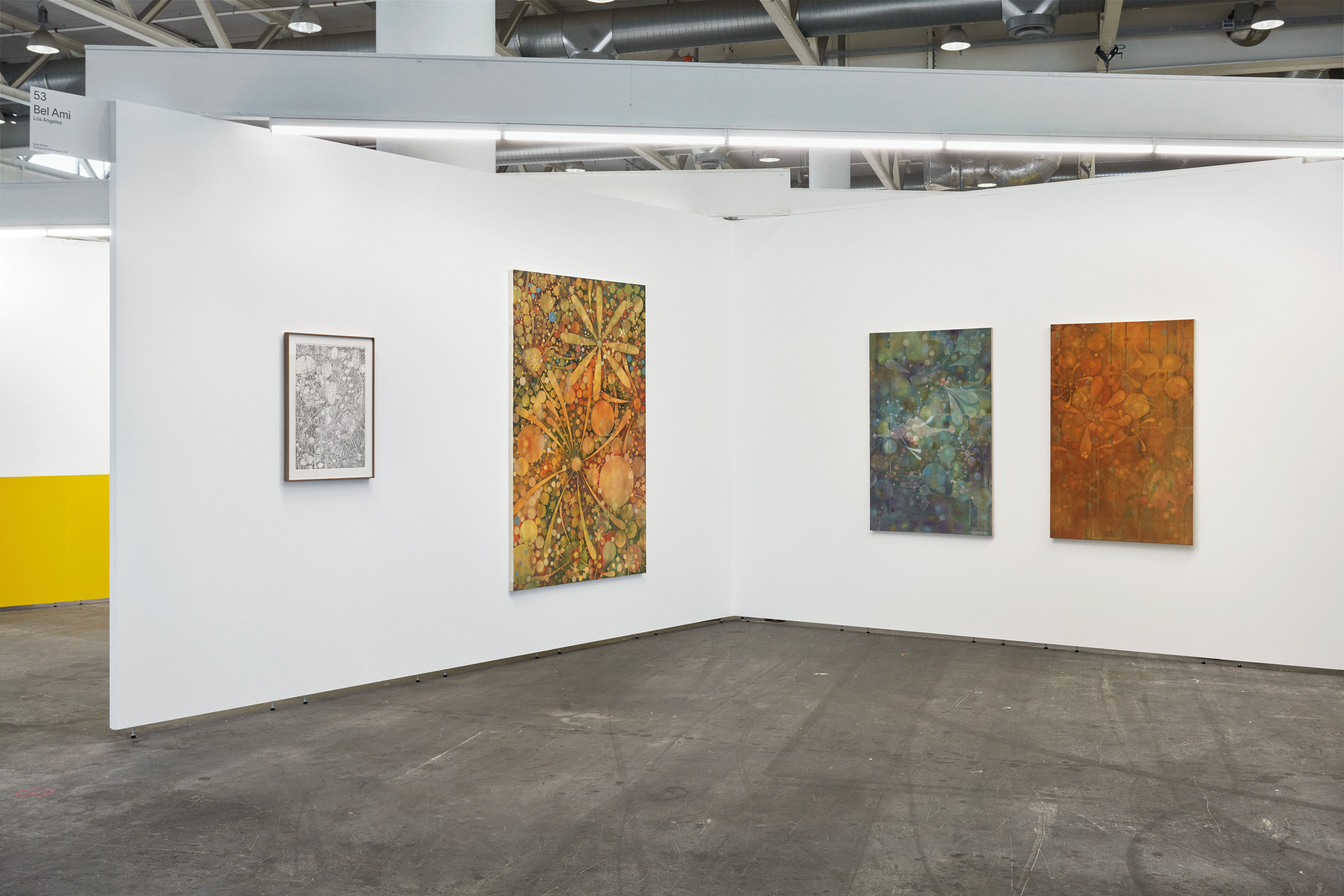 Guillaume Dénervaud renders dense forests of organic and engineered forms using stencils and templates he has collected. These templates include traditional architectural French curves and various ellipses, as well as branded stencils used by real estate agents and furniture designers to sketch diverse industrial elements: the curve of a wall, the shape of bathroom fixtures, plumbing, electrical wiring, etc. As CAD has made these tools mostly obsolete for commercial use, Dénervaud redeploys them to create various visions of the future built on the remnants of today’s industrialized society. These new anticipatory scenarios of dystopian scapes seem more like disrupted habitats than deliberate plans, with mutant flora, overgrown invasive species, rusting motor parts collecting silt in lakebeds, and living tissue merging with electronic circuitry. Flowing shapes reminiscent of parasitic plants or cancerous cells proliferate. Dénervaud infuses the systems with life by using ink and oil paint made from plants, algae, and minerals: the colors don’t only represent nature, they are derived from nature itself, crushed and dissolved and stirred.